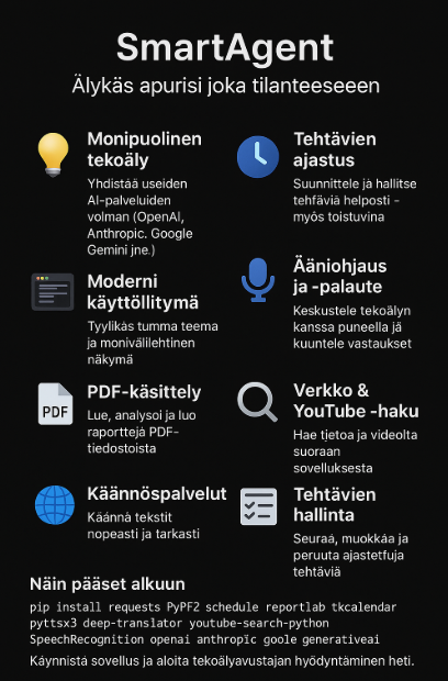 Kokeillaan seuraavaksi rakentaa monipuolisempi “SmartAgent AI-agentti, joka pystyy yhdistämään useiden tekoälypalveluiden voiman yhteen helppokäyttöiseen ja moderniin käyttöliittymään.